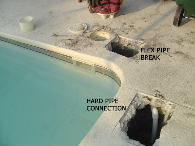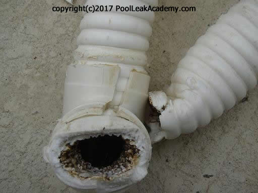 Some skimmers are plumbed in with Flexpipe or spa pipe that can really be effected by chlorine tablets left in the skimmer. 1 out of 10 concrete pools have it- all fiberglass pools have it. It swells so bad that you cant glue a fitting too it. To replace it you have to find the other end that is glued to a hard PVC pipe. |