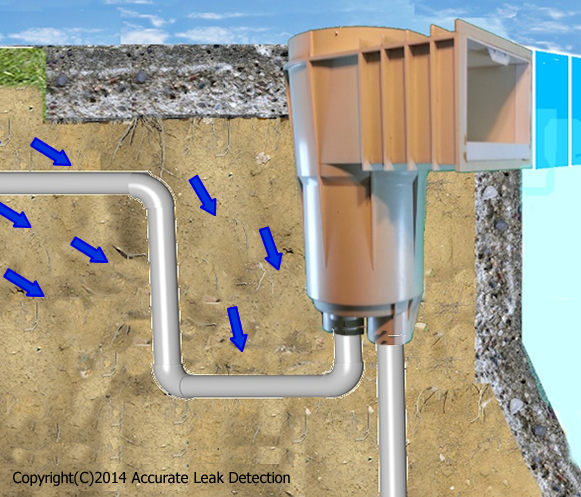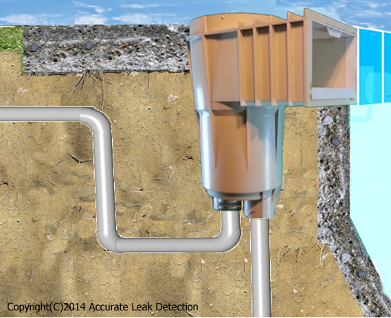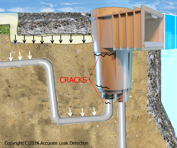The top and the front of the skimmer are set firmly in concrete. But as time goes by the dirt around the pipes and the base of the skimmer settles and stresses the bottom of the skimmer and the joints in the pipes. This is what causes most skimmers to crack: the weight and settling of the soil around it. |
