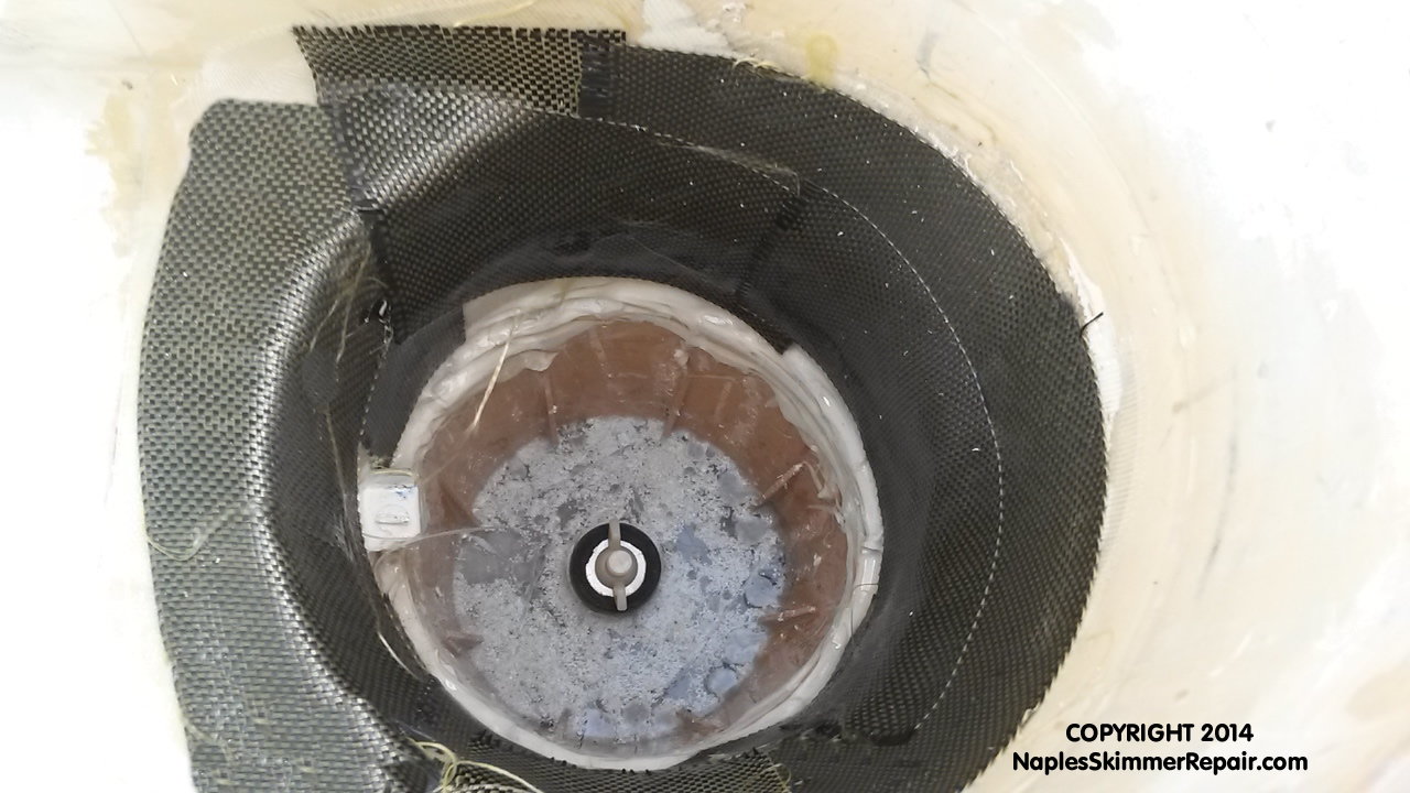 Looking down to where the basket sits in this old skimmer, it was repaired 2 previous times. I spent a long time preping the sides with air sanders and grinders and covered the crack with a carbon fiber/Kevlar composite weave. Its still expermintal but I had fun doing it.