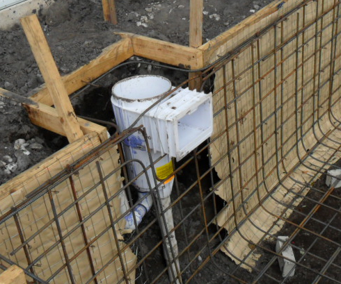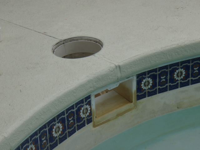 Exposed under the cement is a the plastic skimmer buried deep behind metal rebar. It has a number of plastic ribs to strengthen the structure so its kind of a different looking beast than one would think. Its strong structural features makes it a movie prop in the evil villains hideout: GET SMART "The Nude Bomb" 1980 |