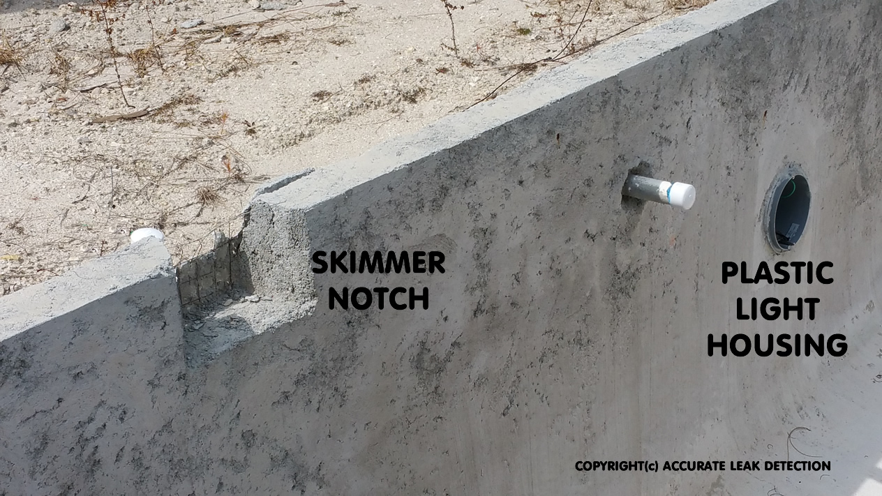 Now not all pools are built the same: the skimmer on the left was installed as the pool is being built- its ready to have the gunnite cement sprayed for the pool; notice this skimmer is built inside of a box structure that is used to support the skimmer and reinforce the wall at the same time- A very solid design. The pool on the right has been built with a thin wall and they just cut out a notch for a skimmer. This wall will probably crack within 5 years. There is also a nitch for the light made out of plastic, If you want to learn more about how those break you can search Youtube for "CRACKED PLASTIC LIGHT HOUSINGS"